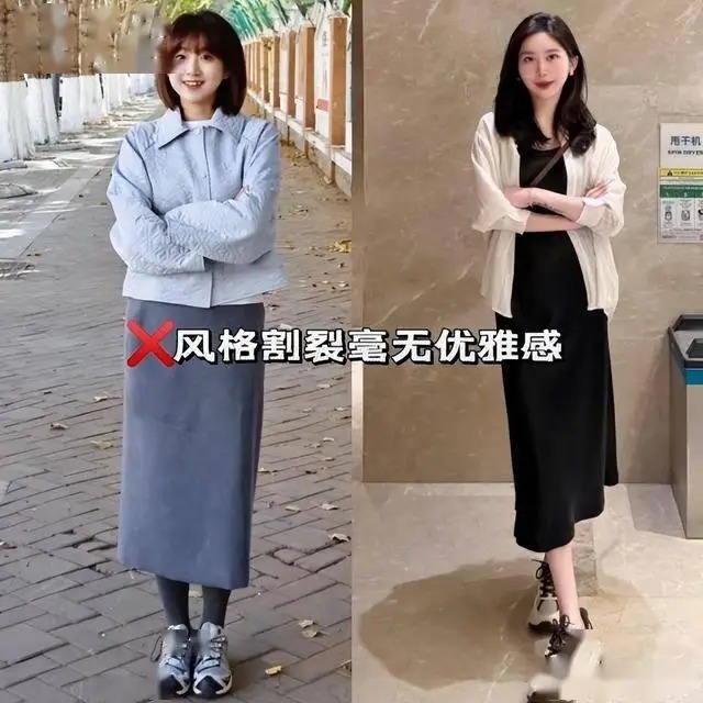 运动鞋的休闲、运动属性,与裙装的柔美、优雅气质天生相悖,强行搭配只会造成风格割裂,让整体造型显得违和、杂乱。再贵的单品都会显得不伦不类,给人一种 “穿搭敷衍、毫无品味” 的感觉,彻底丢失中年女性该有的得体与优雅。