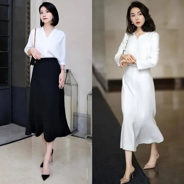 2. 白色衬衫 + 黑色A字半身裙 + 黑色低跟鞋(知性通勤款)