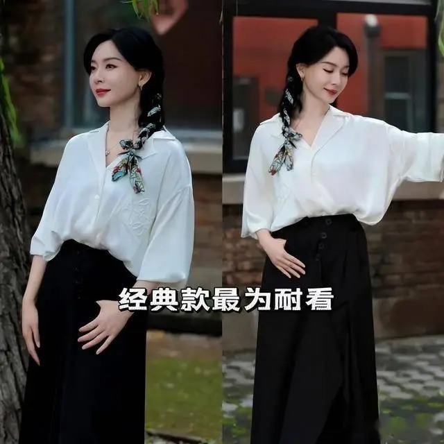 这是陈数极具代表性的知性穿搭,将职场女性的干练与女性的柔美平衡得恰到好处,适合职场、商务场合。基础款白色真丝衬衫材质顺滑垂坠,领口解开两颗纽扣,打造随性 V 领,修饰脸型与肩颈线条。下身搭配黑色高腰百褶半身裙,裙长过膝,高腰设计将衬衫衣角塞入裙内,强化腰线,优化身材比例。鞋子选择黑色粗跟低跟鞋,稳重又显挺拔,与浅灰色裙装形成经典黑白灰配色,低调又高级。
